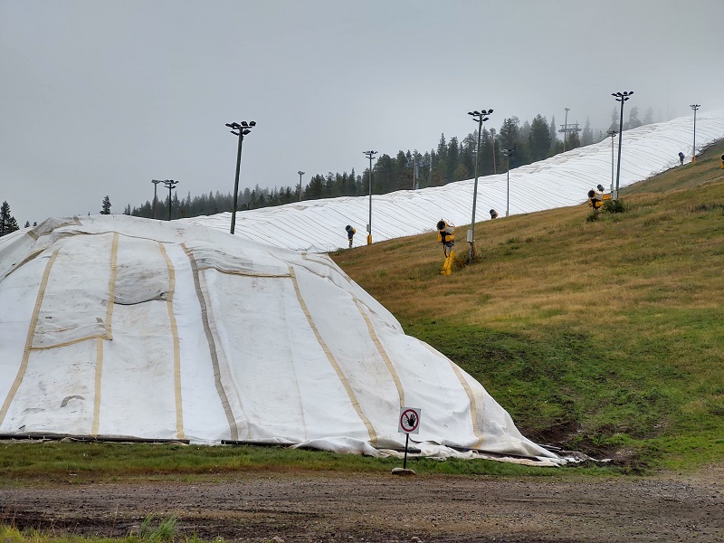 Op die skipiste ligt plastic, het blijkt dat hieronder sneeuw van de winter wordt bewaard onder de islatie om energie te besparen.